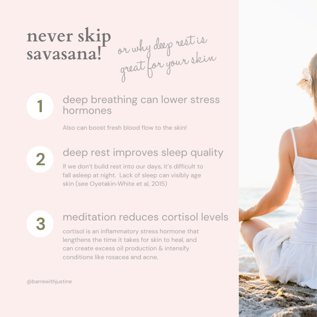 While there isn’t a wealth of research specifically on Savasana, there are some benefits including a significant reduction in stress and lower blood pressure. With growing awareness of the connection between the brain and the skin, we are discovering more about how our stress levels influence the skin. The 2014 article goes deeply into the connection between stress and skin, but essentially anything we can do to reduce stress will help to calm inflammation (rosacea, acne, and psoriasis are all inflammatory conditions), increase circulation to the skin (hello rosy glow!) and prevent collagen degradation and the formation of fine lines.