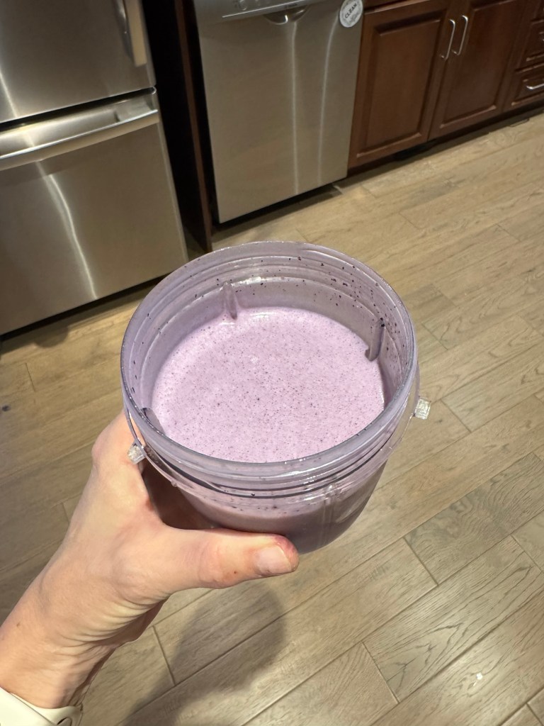 - Blueberry/spinach smoothie – with Greek yogurt, hemp hearts, chia seeds, 1/2 banana, milk, baby spinach and some kind of berries. A splash of fish oil too.